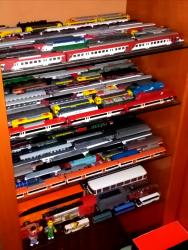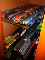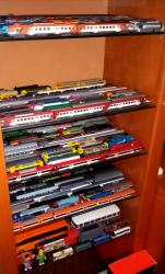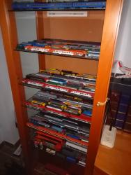 Entre este material hay, además, locomotoras estáticas de varias colecciones del quiosco (casi quinientas, por repetirlas), y material repintado y modificado por mí. La mayor parte de mi colección a escala N, está en su embalaje original, guardado en cajoneras. Muy esporádicamente, incluso sigo comprando algunas novedades, a escala N, si son de mi interés.
