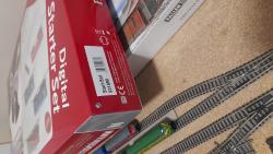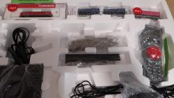 Caja de iniciación digital Fleischmann ref. 931890, comprada nueva en Cavall de Ferro en diciembre del año pasado, aprovechando que anunciaba que estaba en liquidación. Incluye: mando Multimaus, amplificador digital, bloque de alimentación, 1 locomotora diesel 218 de la DB, tres vagones de mercancías DB (a uno de los vagones le falta un enganche). Funciona correctamente, en lo poco que lo he usado.