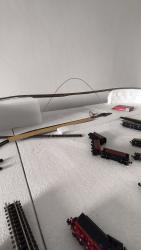 Este fin de semana ha sido productivo y he comenzado mi primera maqueta. Me asombró lo productivo que he sido. No me imaginé progresar tanto en un día y medio. Falta mucho todavía, pero siento que estoy avanzando. No me convence el diseño del centro de la maqueta y estoy pensando en modificarla. Van a quedar dos círculos vacíos (sin vías) y creo que me estoy perdiendo de poder poner más vías y mejores circuitos. Tengo que hacerlo con las vías que tengo. No voy a comprar nada más por ahora, así que una gran estación está fuera de mis posibilidades.