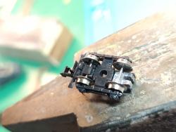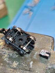 A continuación, un taco de plomo haciéndole forma con un martillo, ranura y pegado en este hueco encima del eje trasero.