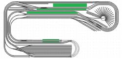Os dejo el esquema de la maqueta, ire poniendo fotos del estado actual del progreso de la construcción. En verde se pueden ver los 3 andenes de la estacion principal y una estacion para trenes de cercanias. la longitud de los andenes me permite la circulacion de todo tipo de trenes, el mas largo tiene 2 metros y 60 centimetros la el apeadero de cercanias. Tiene 3 pasos a nivel con semaforos que he adaptado al estilo de RENFE.